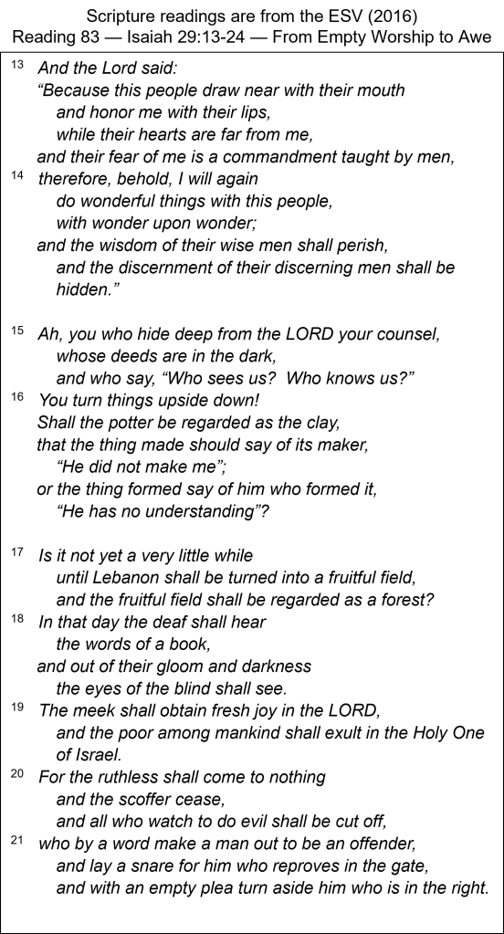 Standing in Awe — Yesterday’s reading about being only associated with holiness extends to today’s reading, describing those who “honor me with their lips, while their hearts are far from me” (v. 13). I am sometimes guilty of that when I sing familiar songs in a worship service and find my mind wandering. That is not intentional worship. Even worse are those who say, “Who sees us? Who knows us?” (v. 15). Their hearts are not only far from God, but they are dismissing Him, trying to stay undisturbed in their sinful ways. God’s plan for reversing this situation was to “again do wonderful things with this people, with wonder upon wonder” (v. 14). Those wonders came through Jesus when “the deaf … hear … the blind … see … and the poor … exult in the Holy One” (vv. 18-19). When the Jews see that, “they will sanctify my name; they will sanctify the Holy One … and will stand in awe of the God of Israel” (v. 23). Thousands of spiritually hungry Jews followed Jesus, and after His Ascension, many thousands of repentant Jews, and then Gentiles, discovered the miraculous indwelling and empowering of the Holy Spirit. The next time you worship at church, please be thinking about your need to “stand in awe” during worship.