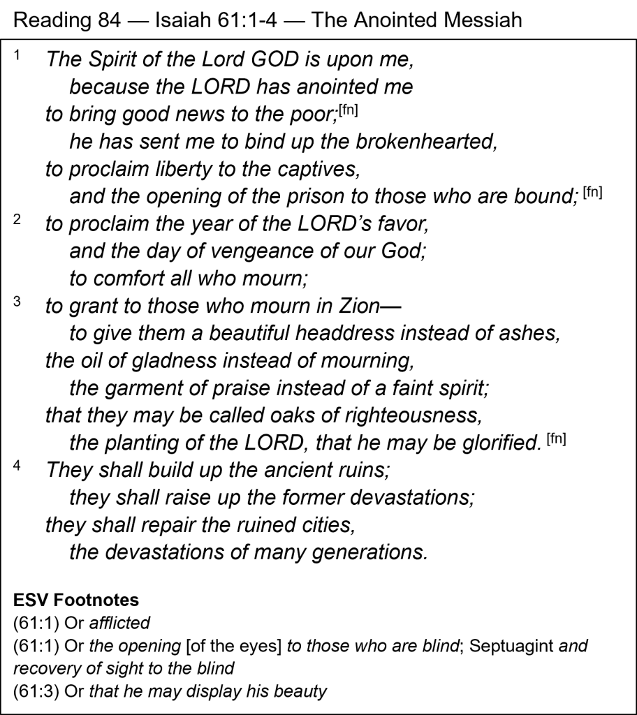 The Effects of the Spirit — We looked at this passage earlier when introducing one of the names of the Holy Spirit: “The Spirit of the Lord GOD.” At that time, however, we did not consider the effects that resulted when the Holy Spirit came upon Jesus during His ministry on earth. Jesus confirmed in Nazareth’s synagogue that He was the main subject of this passage by quoting verses 1-2 and then concluding, “Today this Scripture has been fulfilled in your hearing” (Luke 4:21). Why did the Holy Spirit come upon Jesus? The stated effects were “to bring good news … bind up the brokenhearted … proclaim liberty … opening [spiritual] prison[s] … proclaim … the LORD’s favor … to comfort,” and to give wonderful gifts to redeemed mankind for reconstructing ruins of failed systems (vv. 3-4). We are still in that long period of time as we watch the effects of the Holy Spirit working in individual lives and collectively in the Church. The good news is still being proclaimed to people who are trapped in sinful habits and situations. Needy people are being cared for and comforted by individual Christians and church organizations. The Holy Spirit is working through us to continue the work that Jesus started on earth, until the last one is saved and Jesus returns. After that, “the day of vengeance of our God” (v. 3) will be unleashed on all those who defiantly rebelled and resisted the wooing of the Spirit in their hearts and minds. While there is still time, we believers must continue to do the work Jesus has called us to do and the Holy Spirit empowers us to do.