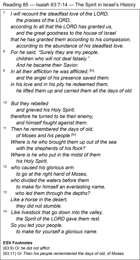 The Spirit of Rest — Three times the Holy Spirit is mentioned in this passage, all in a historical context. First, the Holy Spirit was given to the people of Israel when Moses said that God “brought them up out of the sea” (v. 11a), referring to the miracle at the Red Sea. Yahweh “put in the midst of them his Holy Spirit” (v. 11b). He was their Immanuel (“God with us”) and their Savior (v. 8), and the Spirit led them through the waters and the wilderness. Today, the Holy Spirit is not only in our midst by influencing and leading the Church of Christ, but He indwells each believer. Second, after 40 years of wandering in the wilderness because of their sin, “the Spirit of the LORD gave them rest” (v. 14), bringing them into the Promised Land. That is a picture of the spiritual rest the Holy Spirit gives to those today who are freed from the heartache of sin’s bondage and brought into the family of God. The Spirit is our rest. Third, Israel’s occupation of the Promised Land was filled with periodic times of rebellion against the God who saved them, “But they rebelled and grieved his Holy Spirit” (v. 10). This shows one personal characteristic of the Holy Spirit, i.e., He can be grieved. Later, we will see that Paul warned us about this in the form of a command: “And do not grieve the Holy Spirit of God, by whom you were sealed for the day of redemption” (Eph. 4:30). The Spirit is not only with us, He dwells within us and gives us eternal, spiritual rest.