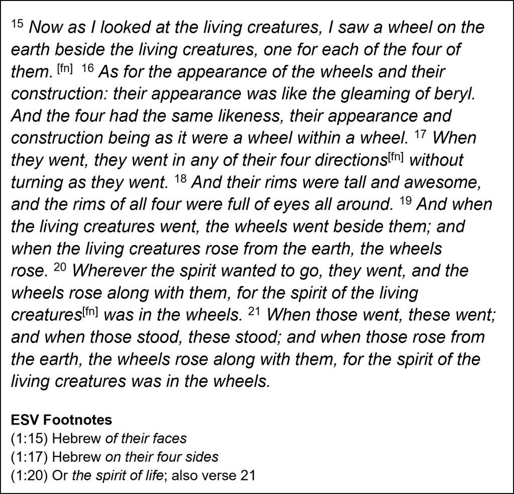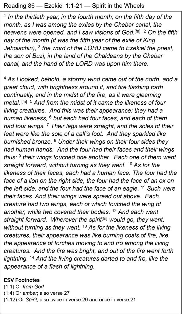 Following Obediently — We move on in today’s reading to the prophet and priest, Ezekiel, who shared in the Jewish exile in Babylon. The visions given to him were fantastic, and he seemed to be constantly struggling to find words to describe what he saw. The vision in the first chapter introduced the arrival of the throne of God (cf. v. 26). The four living creatures he saw and described are later identified as cherubim (10:20). Like the cherubim over the ark of the covenant, these had wings that touched each other. Like the four living creatures in John’s later vision (Rev. 4:7), they had the same four faces of a human, lion, ox, and an eagle. The main reason for our reading about Ezekiel’s vision today, however, involves the gyroscopic wheels that contained “the spirit” (vv. 20-21). What was this spirit? The Christian Standard Bible capitalizes “Spirit,” and other translations indicate that form in a footnote, including the ESV. It does seem to be divine, and if so, it is the Holy Spirit. Notice that this Spirit was in control over the four living creatures. Twice it is said, “Wherever the spirit would go [wanted to go], they went” (vv. 12, 20). That is a picture of the guidance of the Holy Spirit in our lives today. He wants to lead us where He wants us to go. His desire is for us to follow His directions willingly and obediently, and the most rewarding life we could have comes from going where He wants us to go.