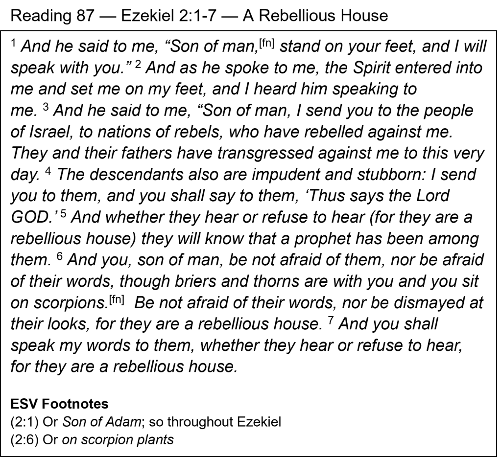 Strengthened to Go — There are several unusual things revealed in this passage. The first is Ezekiel’s title. God calls him, “son of man,” 93 times in this book, the same title Jesus used of Himself 82 times in the New Testament. Only one other person was addressed that way in the Bible, Daniel, and it was only one time (Daniel 8:17). This unusual title shows that the prophet Ezekiel was very special to God. The second unusual feature is that God summarized Israel’s spiritual condition by repeating this statement three times: “for they are a rebellious house” (vv. 5-7). He was working with an unruly crowd. Third, it is said that the Holy Spirit “entered into” Ezekiel (v. 2), rather than the more frequent visit of the Spirit “upon” someone in the OT. The purpose of this encounter with the Spirit was apparently to give strength to Ezekiel. In the last verse of the previous chapter, when Ezekiel said that he saw “the likeness of the glory of the LORD, … I fell on my face” (1:28). The next verse says that the divine voice from the throne said, “Son of man, stand on your feet…” (2:1), but Ezekiel was apparently not able to obey that command until the Holy Spirit “entered … and set me on my feet.” It was then that the prophet received God’s commission for service: “Son of man, I send you to the people of Israel…” (v. 3). He was made to stand so that he could go to work! The Holy Spirit also works in our lives today to give us strength to tackle whatever tasks the Father gives to us. That is what happened at the commissioning of the missionaries sent from Antioch to the Gentiles: “…the Holy Spirit said, ‘Set apart for me Barnabas and Saul for the work to which I have called them’” (Acts 13:2).