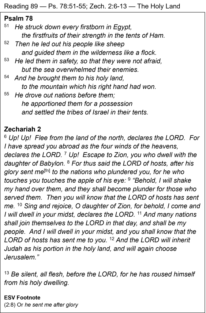Family of Freedom — What response would you receive if you asked 10 people on the street today, “What is the Holy Land?” Almost all of them would say, “Israel.” Just about everyone knows the location of the Holy Land because it has been much in the news for years. Strangely, however, the two passages we read today are the only two places where the term “holy land” appears in the Old Testament. It is interesting that both passages are set in times of Israel’s release from bondage. In the historical Psalm 78, the context of our reading was their deliverance after being slaves for 400 years in Egypt. In Zechariah, the context was at the end of Israel’s 70-year exile in Babylon. The call was to go home to the land God called “holy.” It was holy because God had chosen it to be the home for His people, and it was holy because God’s presence would be there in a special way. A significant extension is seen in Zechariah 2:11, in that “many nations shall join themselves to the LORD in that day, and shall be my people.” That looked ahead to what Jesus would begin, the forming of the Church. Essentially all of us Gentiles are benefiting from that extension, being included in the family of God, the family of freed people. God said this should be our response: “Sing and rejoice … for behold, I come and I will dwell in your midst, declares the LORD” (v. 10).