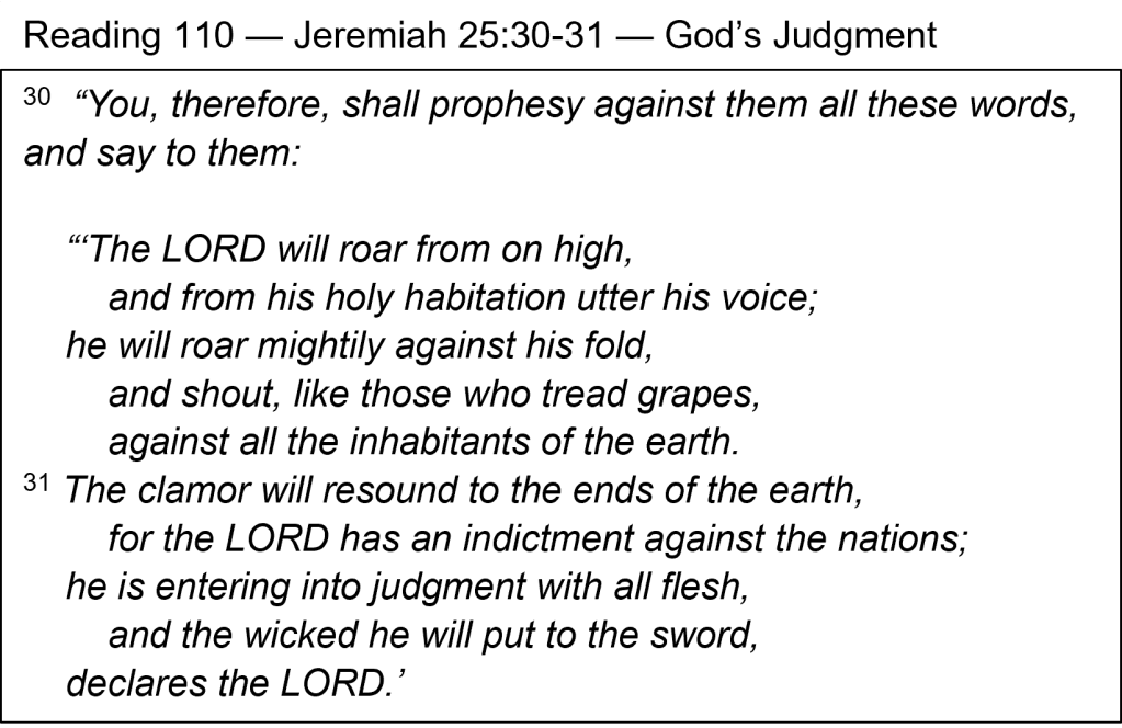 Holy Habitation — This prophesy of God’s judgment goes back to the time before Judah’s defeat by Babylon. Almost all of it is negative, judgment not only “against his fold” (v. 30) but also “against the nations” (v. 31). The wicked will be punished for all generations of people who refuse to follow the Lord. The one positive fact that I got from this passage was the description of heaven as “his holy habitation” (v. 30). That picture appears in other OT statements as well. It is the place from which God blesses His people (Deut. 26:15) and from which He serves as “Father of the fatherless and protector of widows” (Psa. 68:5). The prayers of the priests and Levites “came to his holy habitation in heaven” (2 Chron. 30:27). David said, “I love the habitation of your house and the place where your glory dwells” (Psa. 26:8). Another worshipful response from us toward this ultimate dwelling place of God is to “be silent, all flesh, before the LORD…” (Zech. 2:13). Since God is holy, His habitation in heaven is holy, and we will be with Him there for eternity.