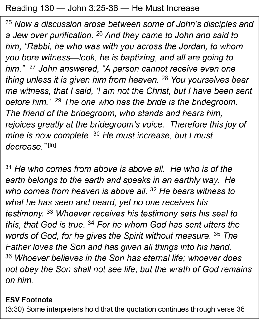 The Measureless Spirit — We encounter the Trinity again in this passage with the Father giving the Holy Spirit to the Son. The way in which He gives the Spirit is unusual, however, in that He “gives the Spirit without measure” (v. 34). We have seen many times in the OT that the Holy Spirit came upon certain prophets and leaders for a particular time and purpose, which was the Spirit given in measure. For Jesus, however, the Spirit was given “without measure,” measureless, being complete in every way, which enabled Him to perform countless miracles and teach amazing truths. It was the Trinity at work. How much of the Holy Spirit do we post-Pentecost Christians possess? All of us who are born again have the Spirit, but the Scripture seems to indicate that being “filled with the Spirit” involves an additional “measure.” After Peter and John were arrested and brought before the Jewish Sanhedrin to be warned about preaching in the name of Jesus, they returned to their Christian friends to tell their story. When they prayed together, “they were all filled with the Holy Spirit…” (Acts 4:31). God added some measure to their experience with the Spirit. More of the Spirit is also available to us as we yield to God in obedience. Paul also commanded the Ephesian Christians to “be filled with the Spirit” (Eph. 5:18).
