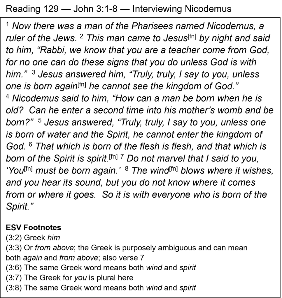 Born of the Spirit — Nicodemus came respectfully, but secretly, to Jesus at night. If he came to ask a question, he never got a chance because Jesus first had an important message for him: “You must be born again” (v. 7). Nicodemus then wanted to know “how” (v. 4) because he only understood physical birth. Jesus had to explain that being born again required spiritual birth. One is born physically to become a physical person but may also become a spiritual person through the Holy Spirit’s action. To enter the kingdom of God, Jesus said that one must be “born of water and the Spirit” (v. 5). What does “water” refer to here? Contextually, the closest connection would be to the water involved in the physical birth, so Jesus would be saying that one must not only be born physically but also spiritually to enter the kingdom of heaven. Those who believe that one enters the kingdom of God through the act of baptism see this water statement as referring to the water of baptism, going further back in context to the ministry of John the Baptist. Others go even further away from the context to believe that Jesus was referring to the prophecy through Ezekiel: “I will sprinkle clean water on you, and you shall be clean. … And I will give you a new heart. … And I will put my Spirit within you” (Ezek. 36:25-27). The bottom line is that being born of the Spirit is having the Holy Spirit enter the heart and life of a person, providing spiritual life in addition to physical life.
