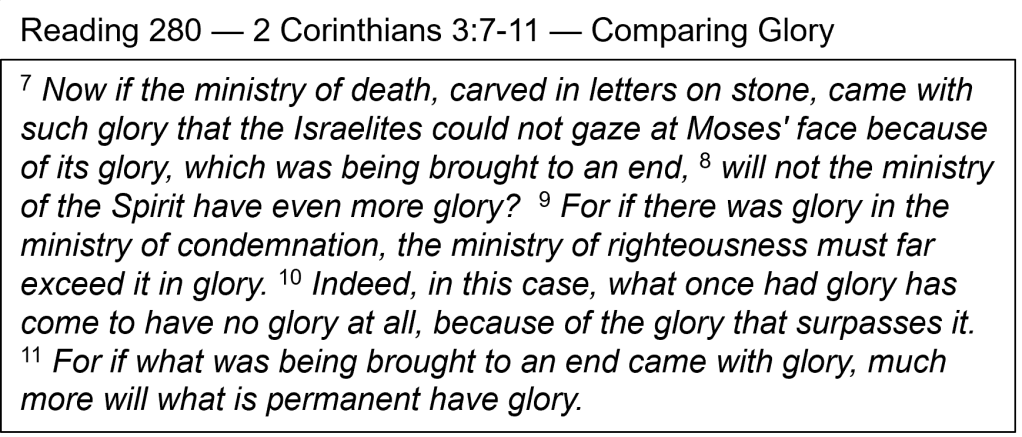 The Ministry of Glory — The New Covenant is referred to here as “the ministry of the Spirit” (v. 8). The death of Jesus initiated this new era, but the Holy Spirit empowers it. That is what the Old Covenant lacked, the power to change lives; it only set the rules. Although it was God-given and glorious, it resulted in “condemnation” for disobedient people. On the other hand, “the ministry of the Spirit” is called “the ministry of righteousness” (v. 9) because that is where it leads and what it provides. The Holy Spirit’s ministry is not only powerful, but it is also permanent (v. 11). It is the end of God’s plan until Jesus returns. We are living in the time and experience of the Spirit’s ministry, so we need to draw on the divine power made available to help us live the godly lives we want to have. That is a life of glory.