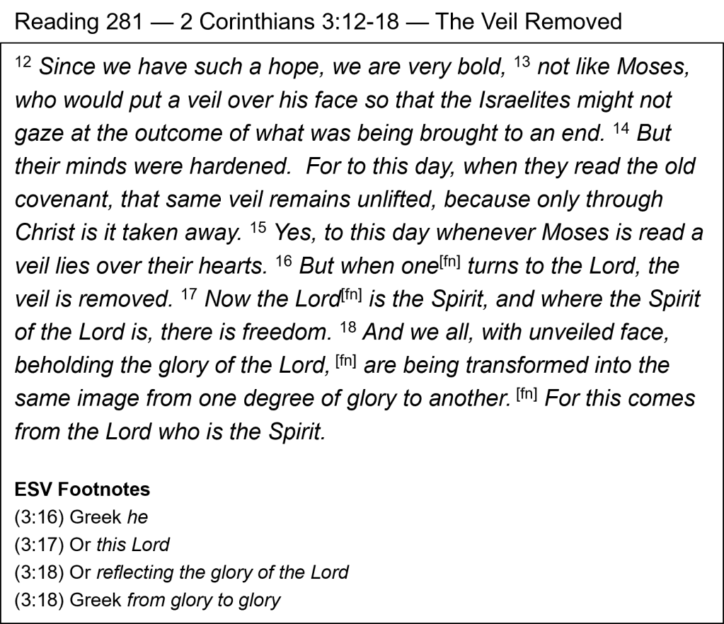 Benefits of the Spirit — The three places “the Spirit” is used in this passage have caused some controversy: “the Lord is the Spirit … the Spirit of the Lord” (v. 17) and “the Lord who is the Spirit” (v. 18). All three certainly involve the Holy Spirit, but each of these expressions are used in combination with “the Lord.” Christ is often referred to as “the Lord” in the NT, which seems to be implied in the expression “the Lord is the Spirit” (v. 17a) because Paul was just speaking of Christ in verse 14 and seems to be referring to Him when he wrote, “when one turns to the Lord,” in verse 16. On the other hand, throughout the Bible, Yahweh is often referred to as “the Lord” (or “the LORD”), which might be the case here as well. This is not suggesting that the Father, Son, and Holy Spirit are one Person, however. Instead, it is reflecting the intricate unity of the three Persons within the Godhead. All three are involved in our salvation and in our gradual growth in holiness. The two benefits mentioned in this passage are freedom (v. 17) and sanctification (v. 18). We are freed from the bondage of sin when we come to know the Lord, and we are being sanctified as we are “beholding the glory of the Lord” (v. 17). We behold this glory every day as we read God’s Word.