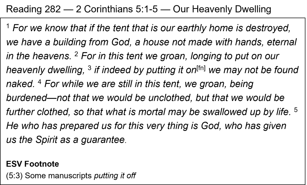 The Spirit as a Guarantee — Paul figuratively sees our human body as a temporary tent and our resurrected body as a permanent structure. Our earthly body is limited, deteriorating, and affected by sin, whereas our heavenly body will be perfect. How can we be sure of this? “God … has given us the Spirit as a guarantee” (v. 5). Our real experience of the Holy Spirit dwelling in our lives provides confidence that the resurrected body that we anticipate is assured. We read about this just a week ago, where Paul wrote that God “has also put his seal on us and given us his Spirit in our hearts as a guarantee” (2 Cor. 1:22). The next time you are experiencing pain from an injury, or you are lying in bed because of an illness, let it remind you of the perfect and eternal body God has promised for you in heaven. It is true, and the Holy Spirit is our guarantee of it.