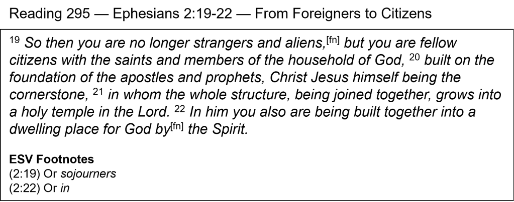 Being Built into a Temple — Paul began this passage with who we are as individual Christians: We are “the saints and members of the household of God” (v. 19). Before our conversion, we were “strangers” (foreigners with no rights) and “aliens” (foreigners who are permanent residents in a city who were given limited rights). Now, we belong as fully accepted “citizens.” Paul then ended this chapter with who we are as collective Christians: “a holy temple in the Lord” (v. 21). This work of “being built together into a dwelling place for God … [is being done] by the Spirit” (v. 22). When the Holy Spirit enters the lives of individuals, they become additional building stones in this spiritual temple of God. When we come together each week to worship, learn, and fellowship, we are not meeting in the temple of God, we are the temple of God. The building where we meet is not the temple, but the temple meets in the building.