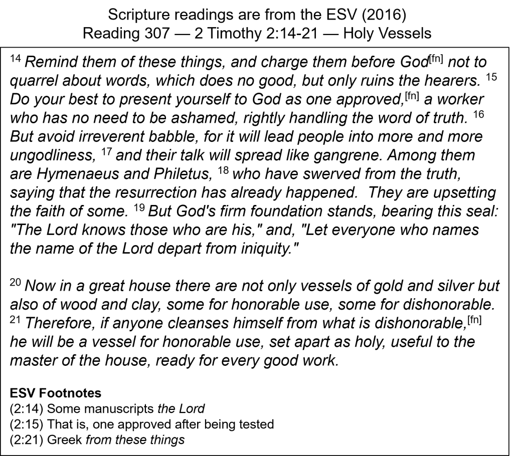 Guarding Our Talk — The twin concepts of godliness and holiness appear in this passage, and they are related. First, Paul said that “irreverent babble … will lead people into … ungodliness” (v. 16; cf. 1 Tim. 6:20). This would include arguing about things that don’t matter and about unorthodox interpretations of Scripture. We need to stick to the truth and guard our talk. We are to be leading others toward godliness, not away from it. Paul then wrote of holiness in his illustration about vessels used in a house: “…if anyone cleanses himself from what is dishonorable, he will be a vessel for honorable use, set apart as holy” (v. 21). Notice the personal responsibility that is involved here (“cleanses himself”). Included in “what is dishonorable” would be things like the meaningless and unhelpful talk that was mentioned earlier. We are to not only guard our talk but our whole lives as well. If we do, we will be “set apart as holy, useful to the master” (v. 21b). Useful vessels are both godly and holy. Using another picture, we are clothed in the righteousness of Christ.