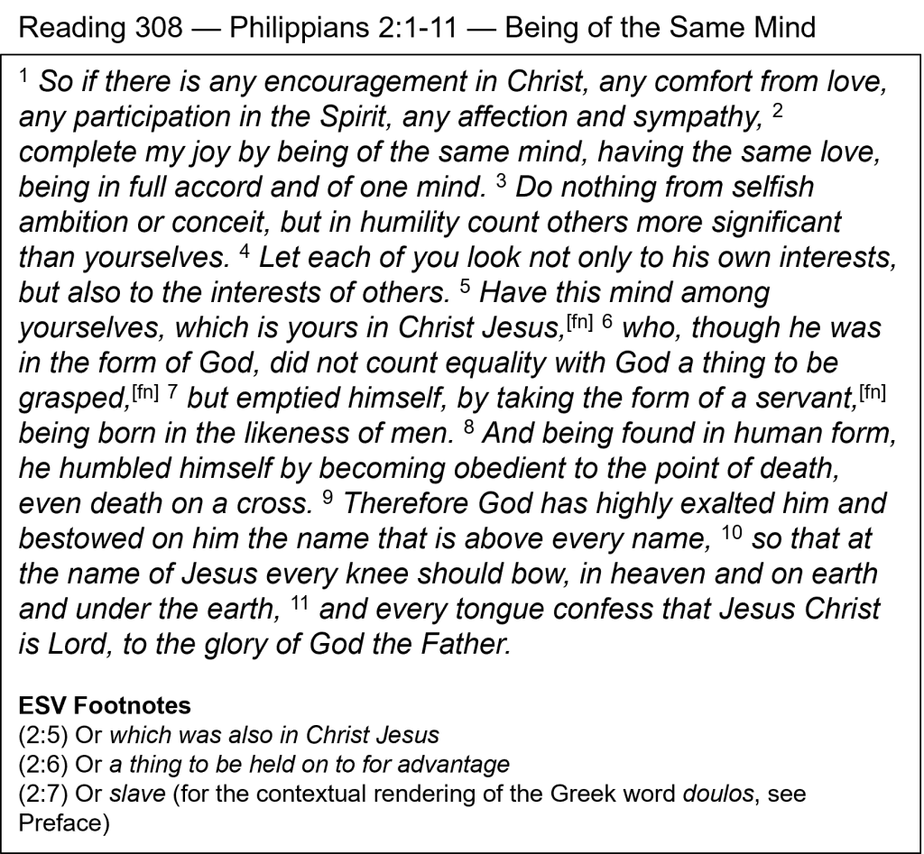 Fellowship in the Spirit — This passage is mostly about the humility and exaltation of Christ, as Paul used Him as the ultimate example of perfect humility. The Philippians were encouraged to be “of the same mind” as Christ (v. 2) so that they might become united in humility and love toward each other. Part of this plea for unity included the reality of their “participation in the Spirit” (v. 1). The Greek word for “participation” here is koinōnía, which is often translated “fellowship.” It describes the personal, intimate, constant, and rich relationship we have with the Holy Spirit who dwells within us. Do you consciously fellowship with the Spirit? When we pray, our minds often picture a God who is far away in heaven, but He is really close—He dwells within us. We should think about that as we go through our day. Purpose to think about Him today and talk to Him often.