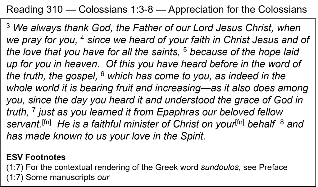 Love in the Spirit — Paul did not plant the church at Colossae; he had never met them. All he knew about them was told to him by Epaphras, who had apparently planted the church. What he had heard about them was good, however, and he wrote this letter to encourage and direct them. One important group character quality they were known for was love. They had “love … for all the saints” (v. 4), and “love in the Spirit” (v. 8). The object of their love was other people, and the source of their love was the Holy Spirit. What spiritual character quality are you known for? Of the three qualities of “faith … love … hope” mentioned in verses 4-5, Paul said elsewhere that “…the greatest of these is love” (1 Cor. 13:13). We should be known for all three but especially love.
