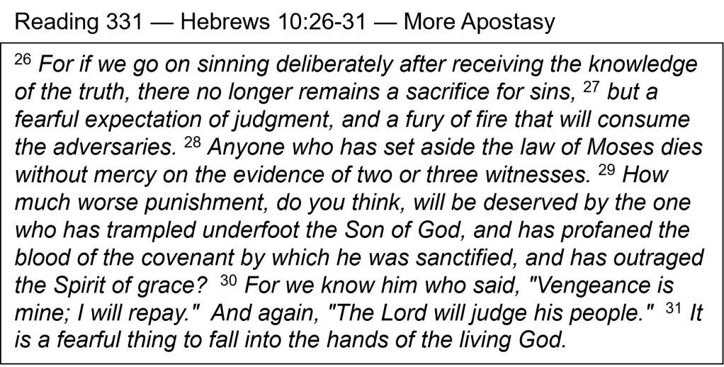 Outraging the Spirit — Almost 300 years ago, Puritan Jonathan Edwards preached a famous sermon from this passage called, “Sinners in the Hands of an Angry God.” It was about apostasy, a complete turning away from faith in Christ. We read about the same subject a week ago in Hebrews 6, where people left the faith after they had “shared in the Holy Spirit” (6:4). In today’s reading, we also have a connection with the Holy Spirit, where a person, who although “was sanctified” (set apart for God’s purpose), “has outraged the Spirit of grace” (v. 29) through their continuing action of “sinning deliberately after receiving the knowledge of the truth” (v. 26). Much has been written trying to get around what seems to me to be the obvious meaning of this passage. Does this make us afraid? It shouldn’t, if we have been born again, are trusting in Christ, and are sincerely trying to walk in His way. This is not talking about backsliding, but about abandonment. There is security for the believer.