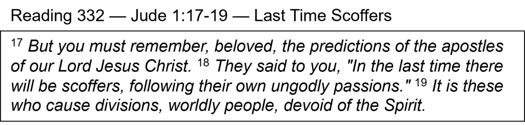 Devoid of the Spirit — The quoted prediction in verse 18 must have been limited to an oral saying because it is not found elsewhere in the NT. Nevertheless, it is true because it is written here in God’s Word as truth. The statement about these “last time … scoffers” sounds very much like the opposition to Christianity we hear around us frequently from our godless society. Here, however, it sounds like they are probably coming from within the churches because of the comment that they “cause divisions” within a moral atmosphere. They are, in fact, “worldly people, devoid of the Spirit.” We see that happening already with so-called church leaders who mock the truth given to us in the Bible, as they put human reasoning above divine revelation. People who do not have the Holy Spirit dwelling within them are led astray with all kinds of false beliefs. That is one reason we should be serious students of the Bible, being people who recognize counterfeit doctrines because they don’t conform to the truth of the Scriptures.