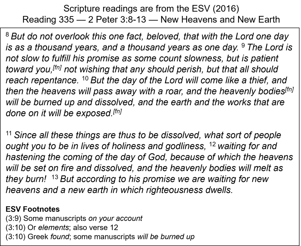 Waiting in Holiness and Godliness — There are two kinds of waiting mentioned in this passage. First, God “is patient … not wishing that any should perish” (v. 9). He is waiting for people to turn to Him for salvation, and He is postponing judgment against sin. Judgment will come, however, and it will be unexpected, loud, and devastating. Unbelievers are not waiting for that because they don’t believe it will happen. We believers, however, are anticipating the same end-time event, but we wait expectantly because “we are waiting for new heavens and a new earth in which righteousness dwells” (v. 13). Won’t it be wonderful to have leaders who are open, honest, and have the genuine interest of others at heart? That will be true in the “new earth.” So, Peter challenges us to practice now for that new kind of life, living “lives of holiness and godliness” (v. 11). We are to be symbols of the future for those around us who have not yet come to surrender to the loving King of kings. We are “hastening the coming” of Christ’s return by influencing those people to turn to Him.