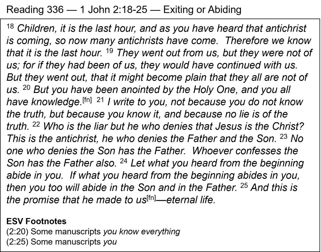 Anointed for Knowledge — There are two kinds of people in our reading for today, one kind at each end of the passage. It begins with a class of people termed, “antichrist” (v. 18), one who “denies the Father and the Son” (v. 22). These are people who were a part of local churches, but “they went out from us” (v. 19). Their doctrinal errors were exposed by the genuine Body of Christ, the Church. They represent the “exiting” person. The other people are featured in the last part of our passage, including the person who “confesses the Son … [and] has the Father also” (v. 23). This is the “abiding” person who abides in “what you heard from the beginning” (v. 24a), the original message of Christ’s saving offer, and those who “abide in the Son and in the Father” in personal relationship (v. 24b). The fact that you have committed yourself to reading God’s Word every day in our “Knowing the Spirit” series shows your interest in abiding in the truth. We also need to be abiding in our relationship with the Father and the Son throughout the day as we think about God, pray to Him, and rejoice in His loving presence.