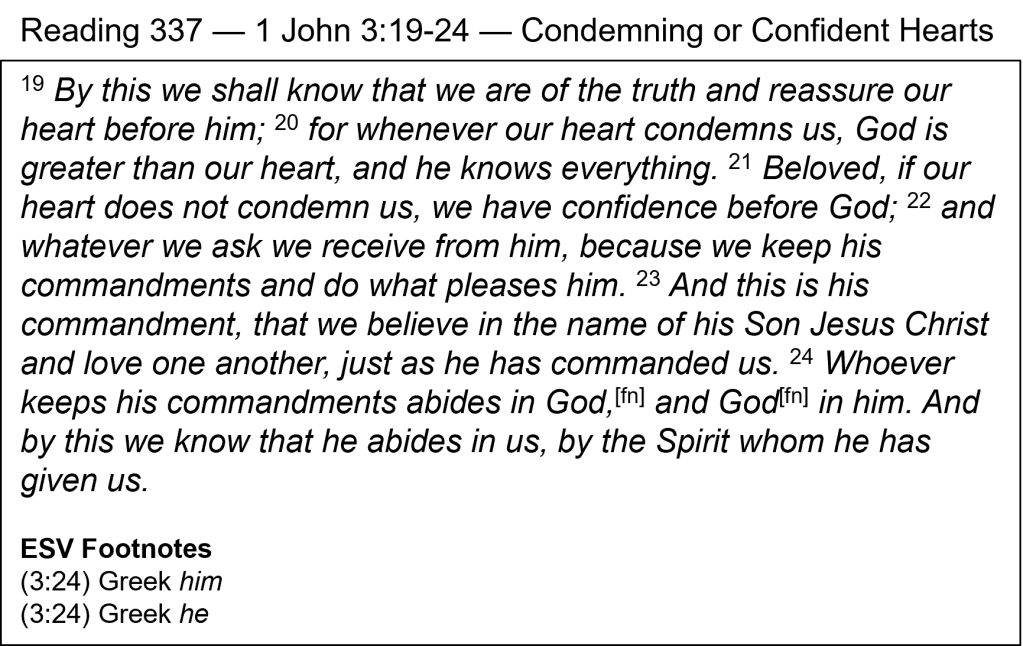 The Abiding Spirit — Twice in this reading, it says, “by this we know” (vv. 19, 24). The first time, it tells us that we “know” God’s truth (v. 19), and the second time, that we “know” God’s presence (v. 24). The words, “by this…,” in each of these verses refers to the means of knowing, i.e., how we know. How do we know that “we are of the truth”? (v. 19). We know it when “our heart does not condemn us” (v. 21). That is talking about conviction of sin, which is the work of the Holy Spirit in our lives. This is similar to Paul’s statement that we should “let the peace of Christ rule in your hearts” (Col. 3:15). Unless we have dulled our conscience through continued sin, the Spirit will convict us of sins we commit, and we will be aware of it and want to correct the problem through repentance. We are “of the truth” when “our heart does not condemn us.” The second thing in our reading that “we know” is God’s presence, “that he abides in us, by the Spirit whom he has given us” (v. 24). How do we know that? Hang on—it is not based on emotional feelings. Rather, it is by obedience: “Whoever keeps his commandments abides in God, and God in him” (v. 23). If God’s Spirit didn’t dwell within us, we wouldn’t care that much about being obedient, and we would be content with doing what feels good to us. If our heart is condemning us with conviction, however, that is the work of the Holy Spirit to get us back on track. If our heart is confident in our relationship to God, then we are doing what pleases Him.