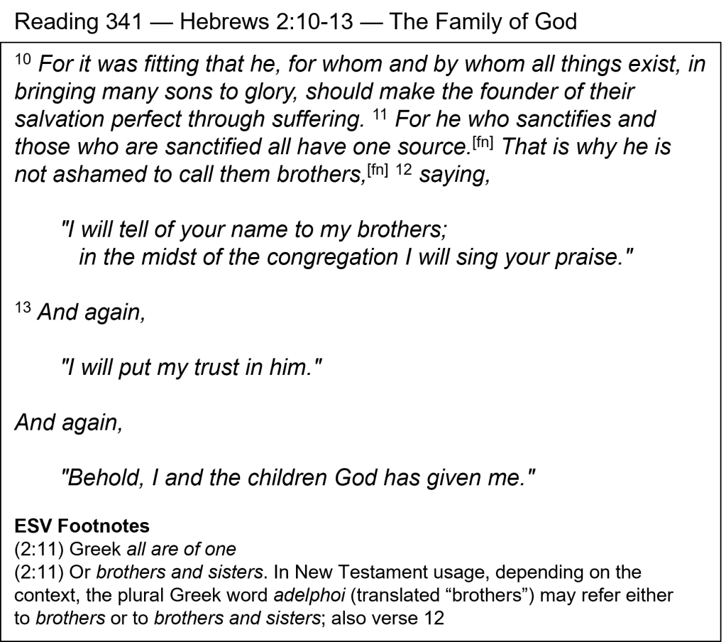 Source of Sanctification — The verb for the words “sanctifies … sanctified” is featured in verse 11. It is the same root word as “holy.” To be “sanctified” is to be made “holy.” At the beginning of this verse, “he who sanctifies,” refers to Jesus because in the previous verse, it was just said that He is the one made “perfect through suffering.” Jesus died on the cross as our substitute to make it possible for us to be sanctified (or made holy). We are placed in the middle of the verse: “those who are sanctified.” At the end of the verse, we have the Father, “one source,” which literally in Greek is, “of one.” I like the way the Legacy Standard Bible puts it: “… of One.” God the Father is the source and goal of our holiness: “…be holy, for I am holy” (Lev. 11:44, 45; 1 Pet. 1:16).