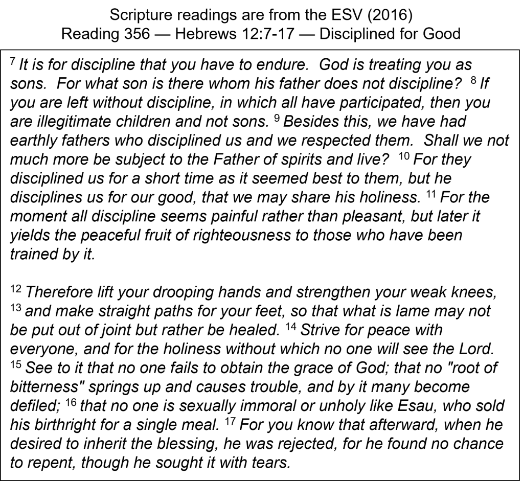 The Value of Holiness — We see holiness in this passage from two different perspectives, first from the father, or trainer, and then from the child, or the student’s point of view. The first paragraph uses the argument of lesser-to-greater. If we accept that our human fathers applied discipline “for our good” (v. 10), then “much more” should we accept being “subject to the [heavenly] Father” (v. 9). Human fathers discipline “as it seemed best to them” (v. 10a), but unlike the heavenly Father, they are not perfect. God the Father disciplines us not only “for our good” but also “that we may share in his holiness” (v. 10b). “Holiness” is the highest value of “good.” The Father knows what is the greatest good for us. Do we have the same view of holiness? If so, then the second paragraph assigns our responsibility: “Strive for … the holiness without which no one will see the Lord” (v. 14). To strive for it means that we are to work at becoming more holy, more sanctified, more set apart for God’s purposes. Reading our Bible and praying every day is a very important part of that. Saying “No!” to temptations to sin is another way to strive for holiness. When we do sin, we must confess it to God as soon as we recognize our wrongdoing. Becoming more holy voluntarily is much more pleasant than being urged toward it through discipline.