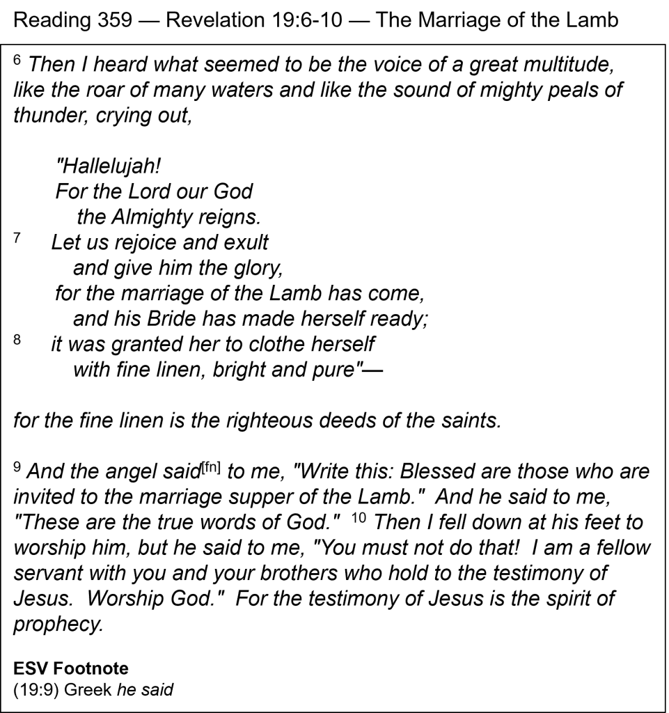 The Spirit of Prophecy — The marriage supper of the Lamb is heaven’s formal celebration of the eternal bonding of Christ, the Lamb, with the Church, His Bride. Notice the contribution of the Bride here: “His Bride has made herself ready … to clothe herself with fine linen … the righteous deeds of the saints” (vv. 7-8). Those efforts contributed to the clothing she wore but not to the means of her getting there. She, the collective saints, was “invited to the marriage supper of the Lamb” (v. 9). The sacrifice of Jesus was His proposal for marriage. The RSVP came from those who were willing to become part of His Bride. This passage ends with the twice repeated, “the testimony of Jesus” (v. 10), which is called “the spirit of prophecy.” In my opinion, the NIV rightly capitalizes “Spirit” here because, as Peter said, “no prophecy was ever produced by the will of man, but men spoke from God as they were carried along by the Holy Spirit” (2 Pet. 1:21). The “testimony of Jesus” is the gospel, which was anticipated in the OT by prophets and revealed in the NT. It is the message we share with others, inviting them to accept Jesus’ gracious proposal.