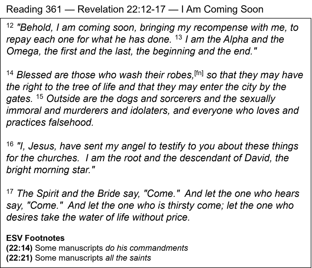 Come! — This passage begins with Jesus’ promise to return (“I am coming soon”—v. 12), and it ends with two prayerful pleas to “Come” (v. 17). Those pleas can be thought of in two ways, however. First, it could be a direct response to Jesus’ promise to come, as it is three verses later: “’Surely I am coming soon.’ Amen. Come Lord Jesus!” (v. 20). It seems somewhat strange to me, however, that “The Spirit” would also be calling for Jesus to come. The second way this call could be understood is as an invitation to unsaved people, as it seems to be in the phrase immediately following: “And let the one who is thirsty come … [to] take the water of life without price” (v. 17b). In that way, it makes more sense that the Holy Spirit as well as the Church would be calling sinners to repent. Come, Lord Jesus! Come thirsty sinner!