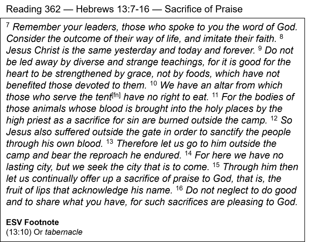 Sanctified Through Blood — This passage is filled with comparisons and contrasts between the old and new covenants. Holiness is one of the themes, using the Greek adjective for the “holy places” within the tabernacle or temple (v. 11), and also using the verb form of the same word, “to sanctify” (v. 12). In contrast to the blood of animals brought into the “holy places,” is the blood of Jesus shed “outside the gate” (v. 12), transferring the focus of sacrifice from lambs to the Lamb and broadening the location of worship from the tabernacle or temple to the world. The “sacrifice for sin” in verse 11 was offered once a year on the Day of Atonement, whereas the sacrifice of Jesus was offered once for all time. Then, in a different way, there is our “sacrifice of praise,” which we “continually offer” (v. 15) in grateful response for what God has done for us. Also viewed as our sacrifice in verse 16 is for us “to do good,” in general, and “to share what you have,” in particular. Our sacrifices to God are to be those of praise and generosity.