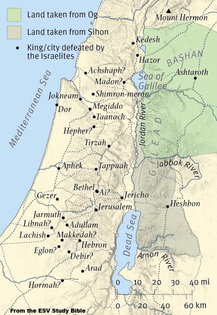 Taking the Land — These two chapters basically wrap up the conquering phase of Israel’s taking over the land given to them by Yahweh.  Like the previous fight against the Jerusalem coalition, the main battle here was started by a collection of many cities formed by the king of Hazor.  They may have outnumbered Israel’s army, but God promised victory, saying “tomorrow at this time I will give over all of them, slain, to Israel” (11:6).  Joshua struck quickly and killed them all (vv. 7-8).  Then he went to the important city of Hazor, whose king had started the war, conquered it and its king, and plundered and burned it (vv. 10-14).  After that, “Joshua made war a long time with all those kings” of the coalition (v. 18) until their cities were also taken (see the map).  God’s part in all this fighting was revealed at this point: “For it was the LORD’s doing to harden their hearts that they should come against Israel in battle” (v. 20).  Then, to face the 10 spies’ fear of the giant Anakim people who made them seem like “grasshoppers” (Num. 13:33), Joshua also killed almost all of them (Josh. 11:21-22).  Chapter 12 summarizes the territories taken by Moses and Joshua, obtaining victory over 31 kings (12:24).  The rest of the book of Joshua is concerned mostly with settling the Jews in their newly acquired territories.
