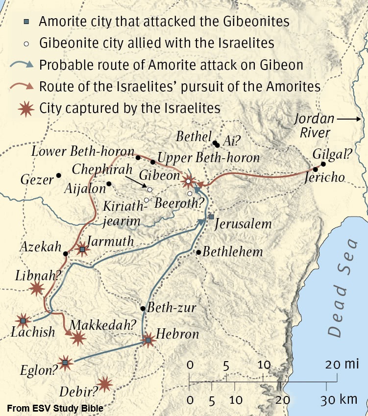 Rewards of Revenge — This chapter features two military campaigns.  The first one was to defend Gibeon, the city that tricked Joshua into a covenant of not conquering them.  They were being attacked by a coalition of the armies of five Amorite kings led by the king of Jerusalem, who was motivated by revenge because Gibeon had secured peace from Joshua (v. 4).  If I were Joshua, I think I would have ignored Gibeon’s cry for help and let them be wiped out—no more covenant to worry about!  God had a different plan, of course.  He wanted to wipe out the armies of five cities that were doomed to disaster.  God would contribute general panic, huge hailstones (v. 10), and an answer to Joshua’s prayer to make the sun stand still for a whole day to prolong the time to fight (v. 13).  Again, if I were Joshua, I might not have asked for more fighting time, since his army had not only already fought for many hours but had also missed a night’s sleep while marching uphill for 15 miles (24 km) in the dark.  God agreed with Joshua, however, and a mighty victory resulted.  The second military campaign was to essentially conquer and gain control of the area south of Jerusalem (see the map).  As God had commanded (v. 40), these seven cities were wiped out so that there were “none left” (v. 28; cf. vv. 30, 32, 33, 35, 37, 39, and 40).  All of that was started by a king who sought revenge.  Beware when you feel like you want to “get even” with someone!  It might backfire.