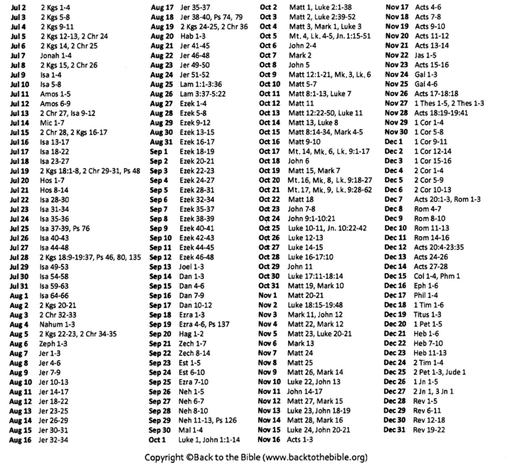 Read through the whole Bible chronologically (A…B…C…) in your own version by following the schedule below, provided by Back to the Bible.